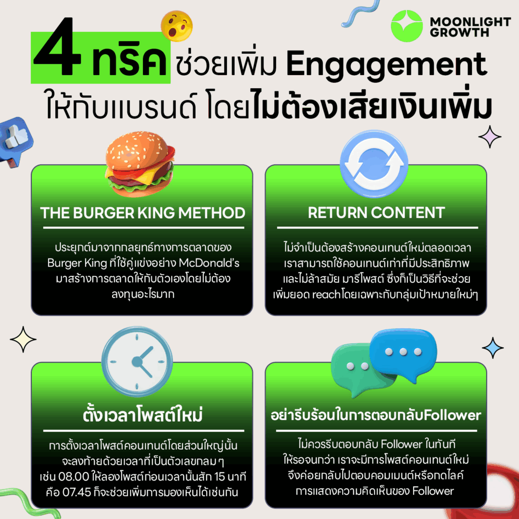 1. The Burger King Method – ใช้คู่แข่งช่วยโปรโมท Burger King เคยใช้กลยุทธ์ตลาดเจ๋งๆ ด้วยการเปิดร้านข้าง McDonald’s เพื่อดึงดูดลูกค้าของคู่แข่งมาเป็นของตัวเอง! คุณก็ทำได้บน Social Media โดย: • โพสต์คอนเทนต์เวลาใกล้เคียงกับคู่แข่ง • ทำให้คอนเทนต์ของคุณโผล่ในฟีดของกลุ่มเป้าหมายเดียวกัน • ช่วยเพิ่มโอกาสที่คนจะเห็นโพสต์ของคุณมากขึ้น